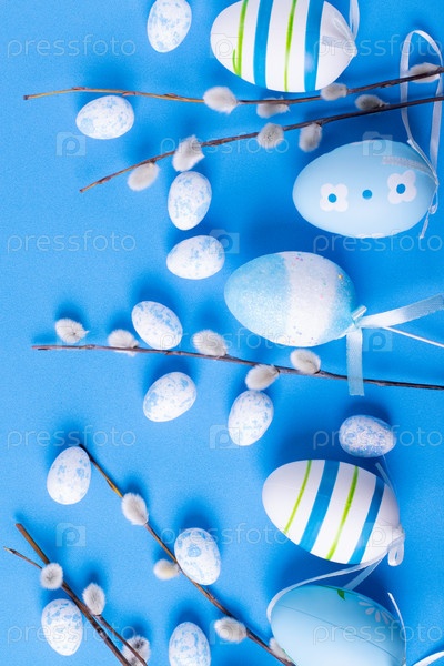 Синий пасхальный фон с декоративными яйцами и ветками ивы. Праздничная плоская планировка. Монохромный