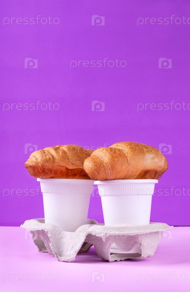 Круассан и одноразовая чашка кофе в картонной коробке на фиолетовом фоне. Еда и напитки на вынос