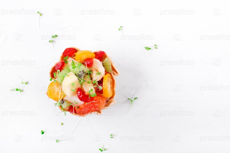 Фруктовый салат в вафельном стаканчике на белом. Грейпфрут, банан, кумкват, груша, яблоко, киви, сушеная вишня и микрозелень смешаны и подаются. Детское питание