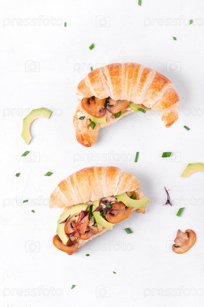 Сэндвич с круассаном с яичницей, жареными грибами, авокадо и сливочным сыром на белом столе