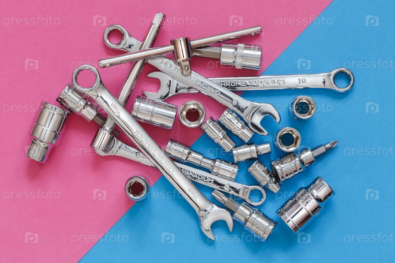 Различные гаечные ключи и инструменты на розовом и синем диагональном фоне, вид сверху