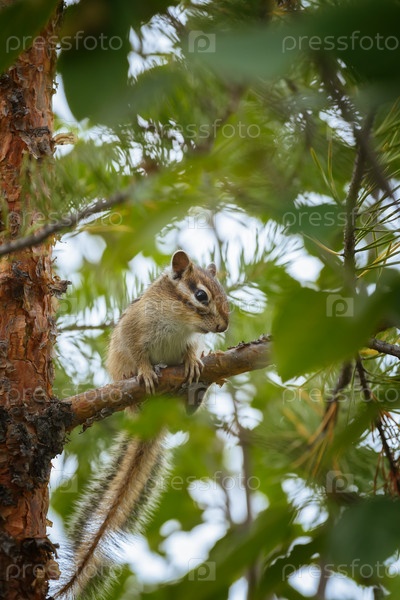 Молодой бурундук сидит на сосновой ветке в обрамлении зеленых листьев