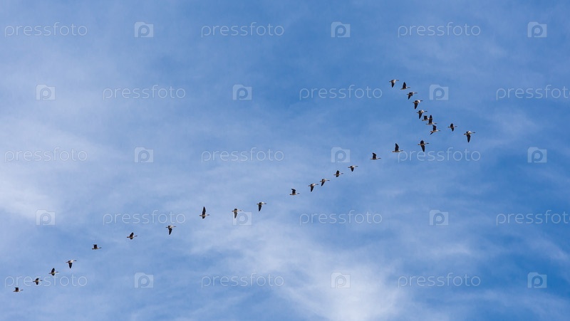 Стая гусей в форме клина на фоне голубого облачного неба