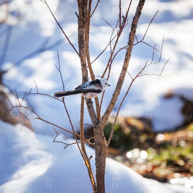 Длиннохвостая синица сидит на ветке дерева на фоне снега