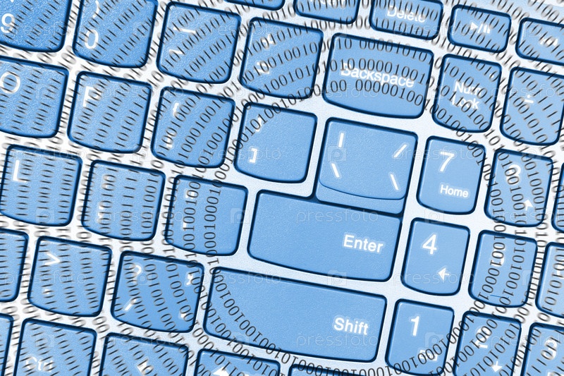 Клавиатура ноутбука, вид сверху с концентрическими кругами, образованными двоичным кодом, состоящим из цифр 1 и 0