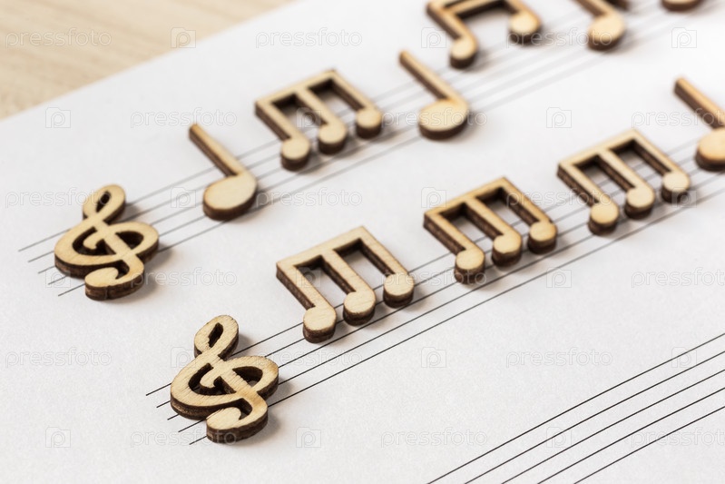 Деревянные ноты лежат на столе. Диагональ с малой глубиной резкости