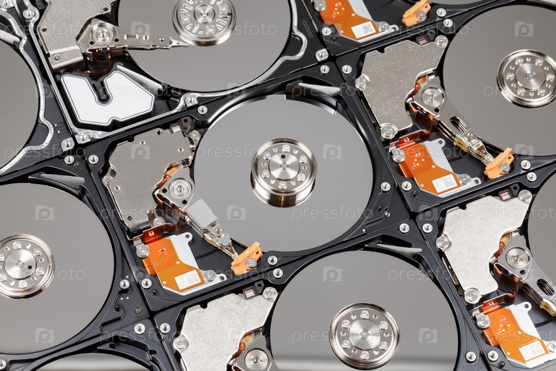 Много жестких дисков подряд, с открытыми крышками, крупным планом