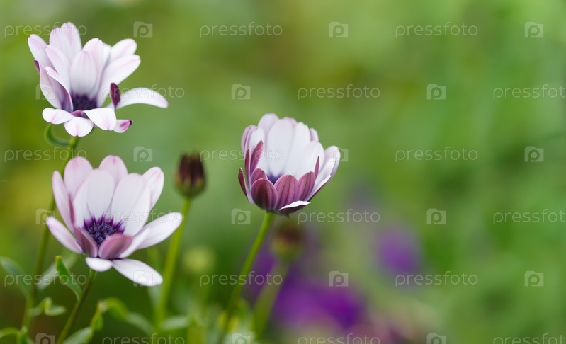 Три белых цветка арктотиса на светло-зеленом размытом фоне