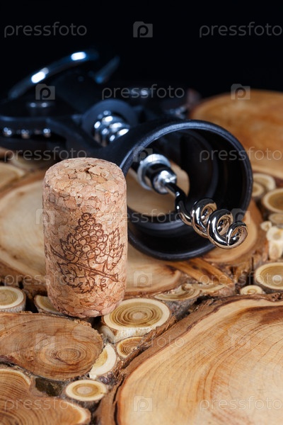 Пробка и штопор на доске из спилов дерева, на черном фоне, с малой глубиной резкости