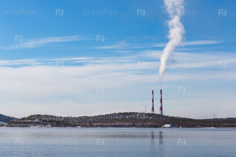 Осенний пейзаж на озере. Холмы, покрытые инеем и трубы с дымом