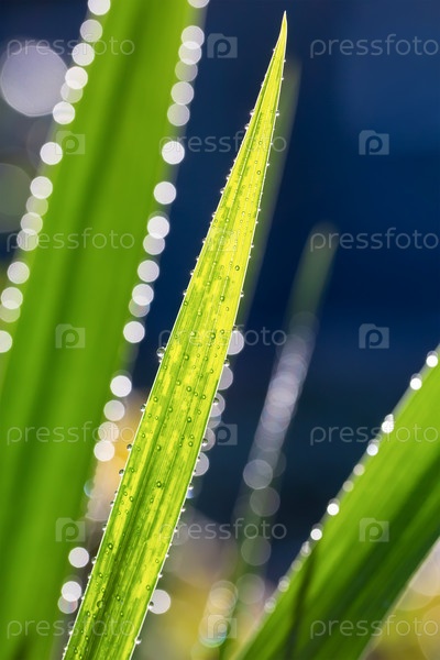 Крупный план травы с каплями воды и размытым фоном с эффектом боке
