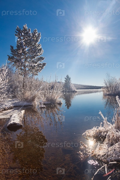 Осенний пейзаж на озере. Деревья и трава покрыты инеем. Отражение солнца в воде. Безоблачное голубое небо