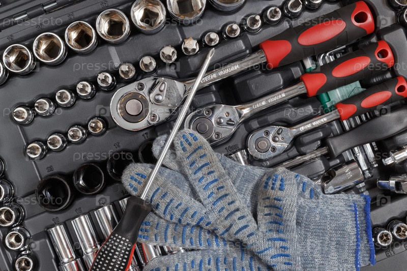 Набор инструментов автомеханика и тканевые перчатки. Вид сверху