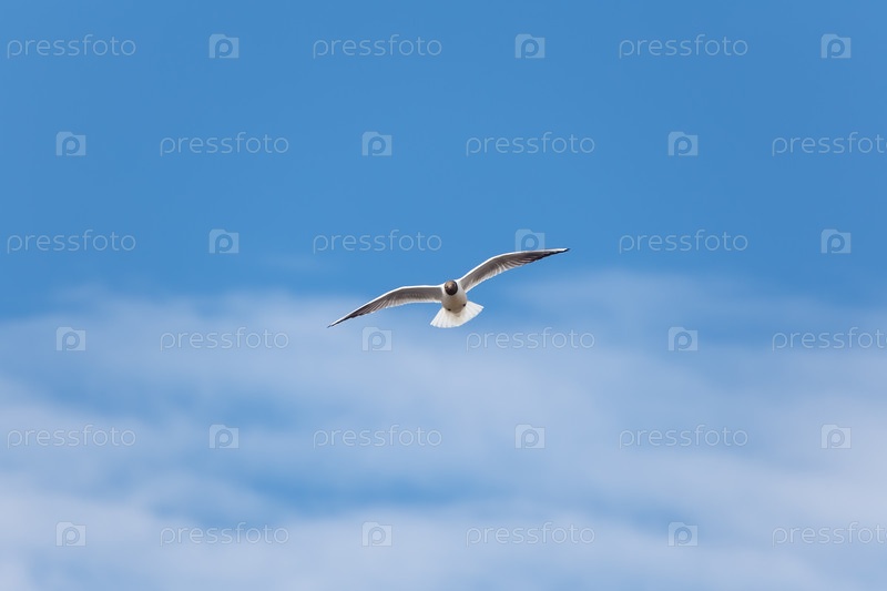 Белая крачка с черной головой летит на фоне облаков в голубом небе