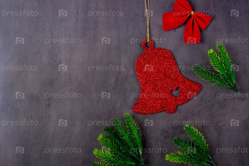 Новогодний фон с украшением в форме красного колокола на сером столе. Праздничная новогодняя квартира лежала с копией пространства