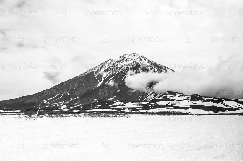 Вид на вулкан Корякский в пасмурную погоду, полуостров Камчатка, Россия