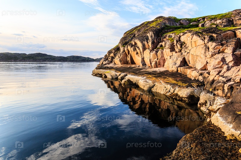 Северное полярное лето. Красивая береговая линия Баренцева моря, скалы, отражающиеся в спокойной водной глади. Северный Ледовитый океан, Кольский полуостров, Россия