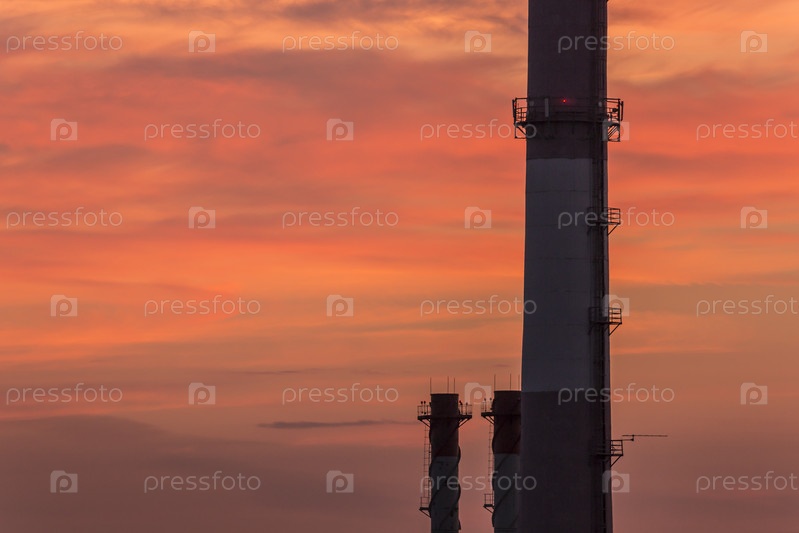 Загрязнение воздуха в городской среде, крупный план крупных промышленных труб на закате