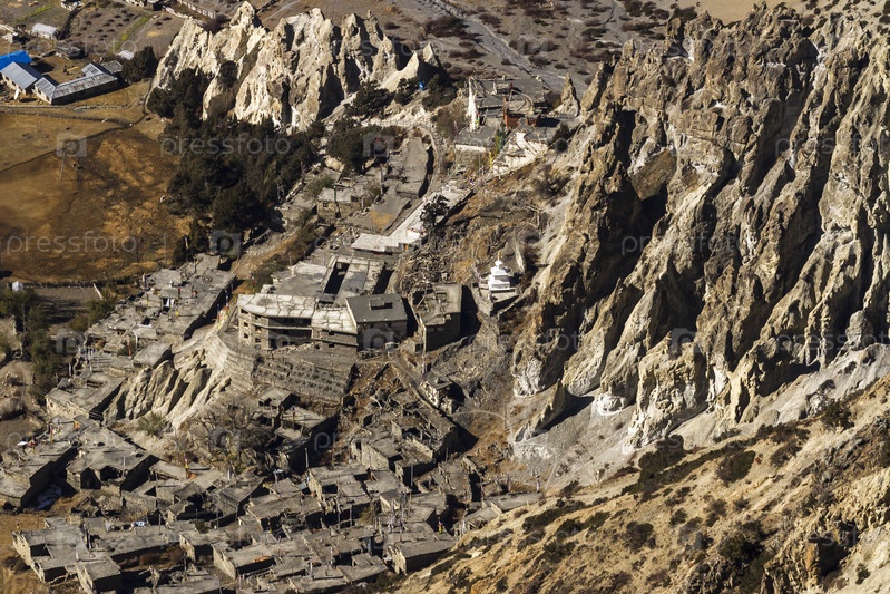 Азиатская горная деревня Брага (Брака) в Непале, Гималаи, заповедник Аннапурна