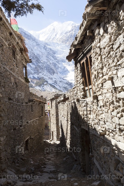 Узкая каменная улица в небольшой деревне Мананг, Непал, Круг Аннапурны