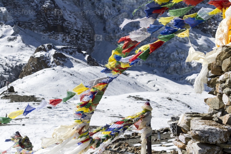 Каменная ступа с молитвенными флажками у озера Тиличо. Непал, Гималаи, заповедник Аннапурна