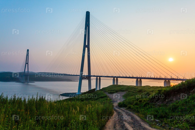 Вантовый мост "Русский мост" на остров Русский на закате. Владивосток, Приморский край, Россия