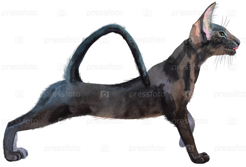 Восточная кошка акварелью. Ручной обращается черный короткошерстный питомец на белом фоне