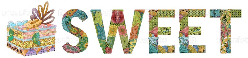 Художественный дизайн ручной росписи. Ручной рисунок слова СЛАДКИЙ с кусочком торта для футболки и других украшений