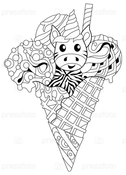 Мороженое с головой единорога. Нарисован черно-белым контуром для раскраски страницы