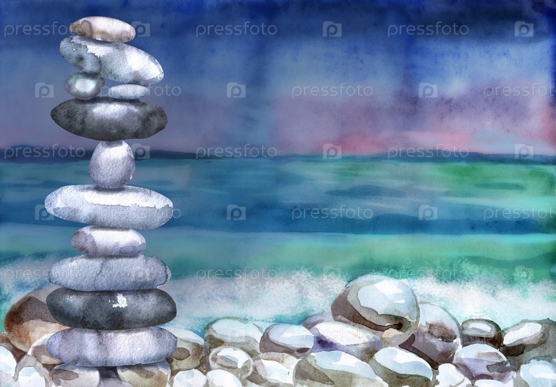Акварельный морской пейзаж из плоских камешков для дизайна обоев. Красочные обои. Фоновая иллюстрация