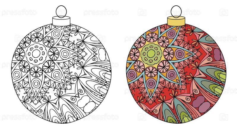 Zentangle стилизованные рождественские украшения. Ручной рисунок векторного ожерелья. Шар для покраски и крашенный образец