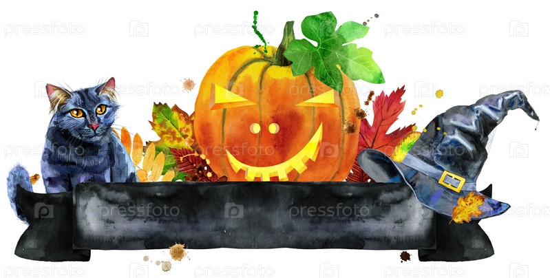 Черный баннер с красочными падающими осенними листьями и тыквой