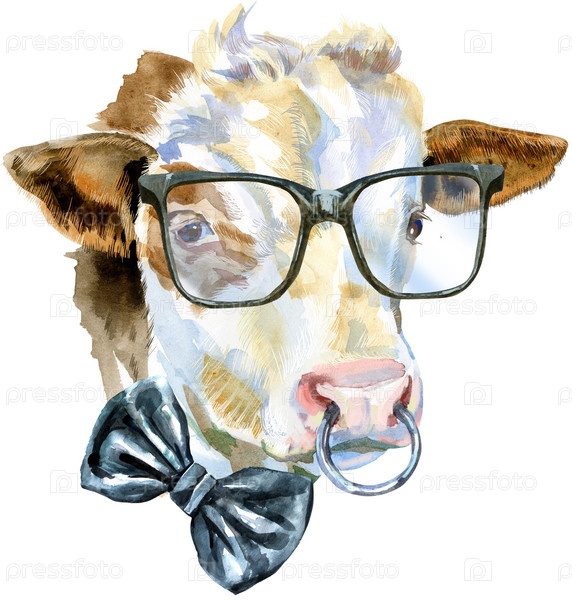 Акварельная иллюстрация белого быка в очках и галстуке-бабочке