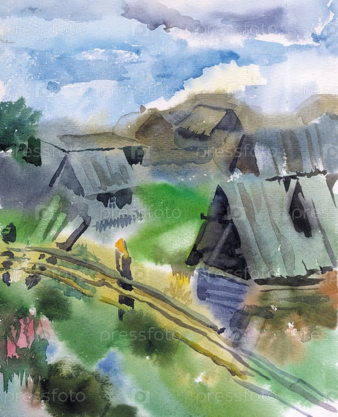 Акварельный рисунок сибирской деревни