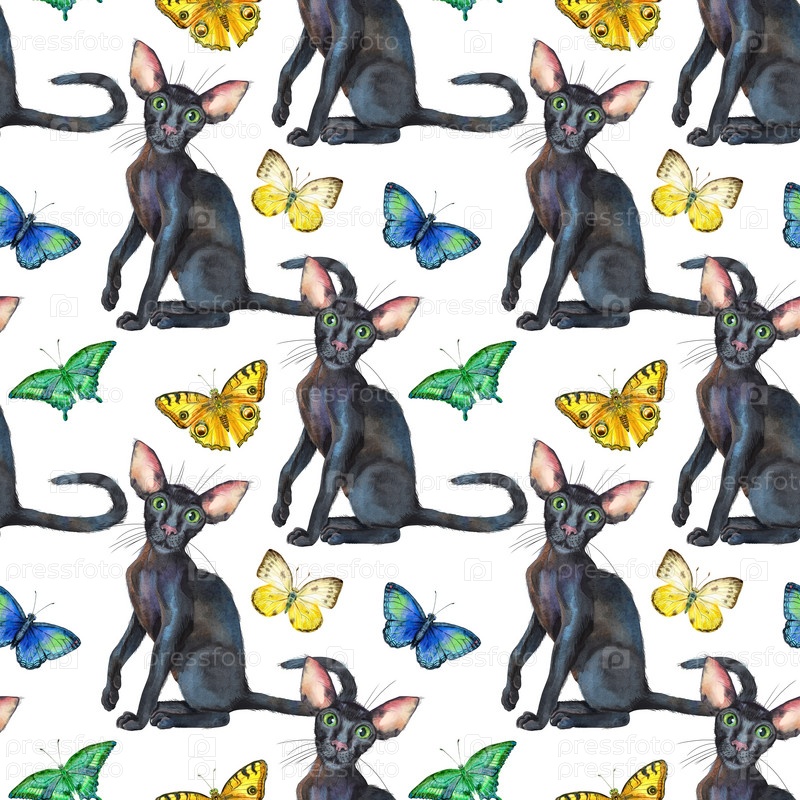 Бесшовный рисунок акварельных восточных кошек. Ручной обращается черные короткие волосы домашних животных на белом фоне