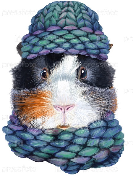 Симпатичная морская свинка в вязаной изумрудной шапке. Свинья для графики на футболках. Акварельная иллюстрация абиссинской морской свинки