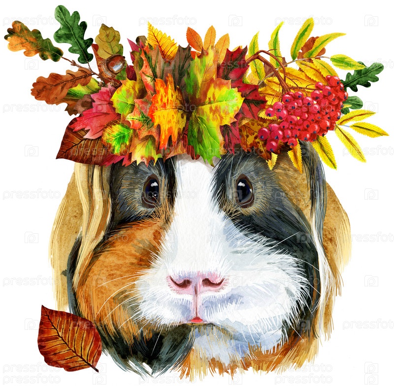 Морская свинка с венком из листьев. Свинья для графики на футболках. Акварельная иллюстрация морской свинки Шелти