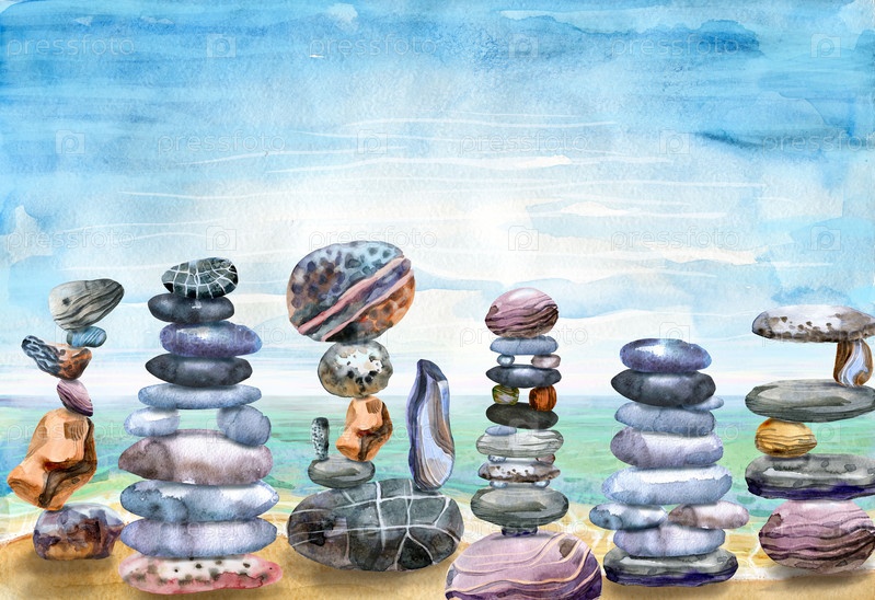 Акварельные морские стеки из плоских камешков для дизайна обоев. Красочные обои. Фоновая иллюстрация