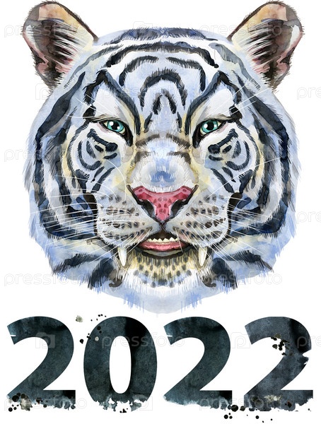 Акварельная иллюстрация белого тигра с номером две тысячи двадцать два