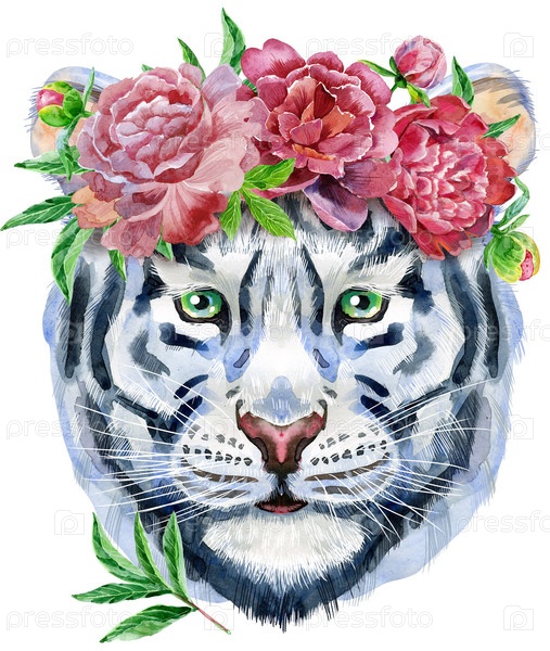 Красочный белый тигр в венке из пионов. Акварельная иллюстрация диких животных на белом фоне