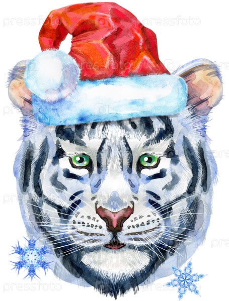 Акварельная иллюстрация белого тигра в шляпе Санты