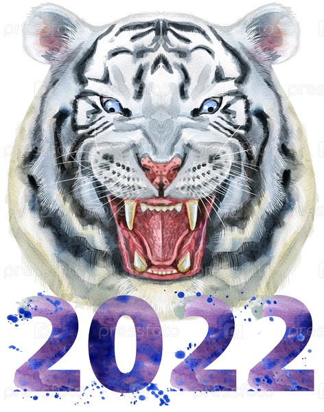Тигр ручной работы. Акварельный рисунок головы белого тигра, голубые глаза с номером две тысячи двадцать два
