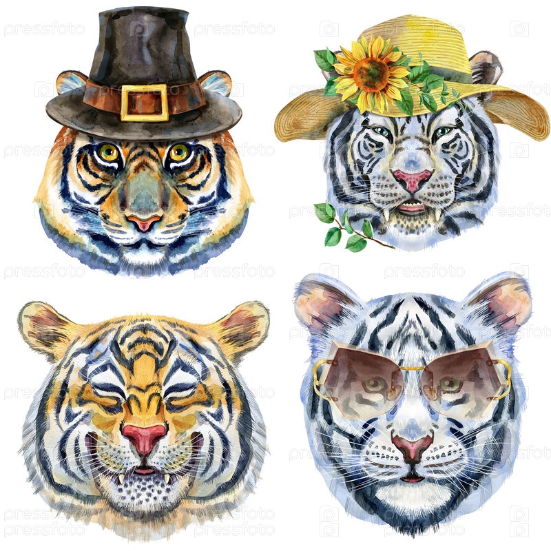 Набор портретов тигра. Акварельная иллюстрация диких животных на белом фоне