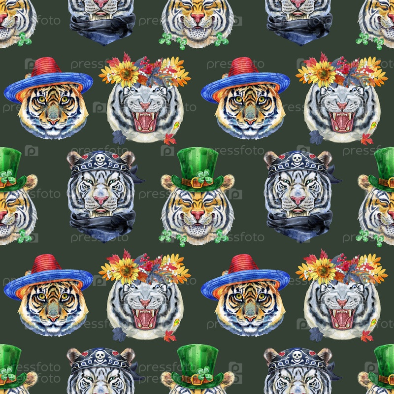 Акварель бесшовный узор с милыми тиграми на зеленом фоне. Модный дизайн ткани