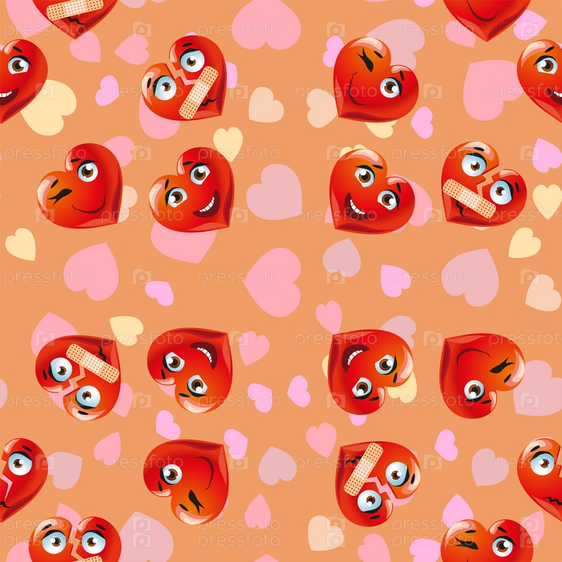 Бесшовный узор. Смешные милые лица персонажей красные сердца в День святого Валентина