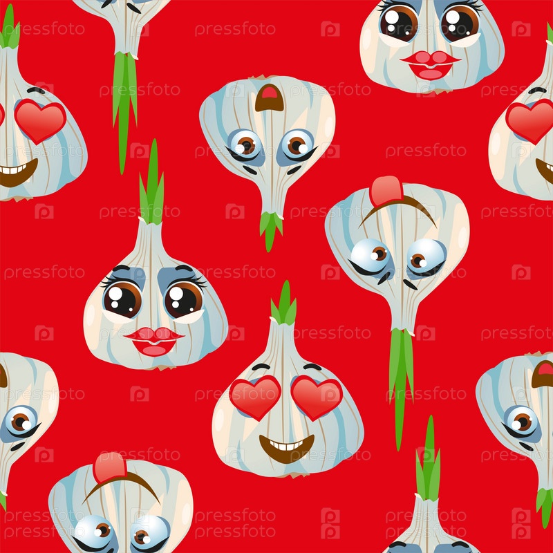 Бесшовный узор из чеснока. Смешные милые лица персонажей