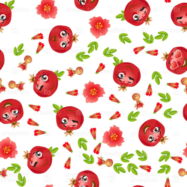 Бесшовный узор из экзотических фруктов граната. Смешные милые лица персонажей