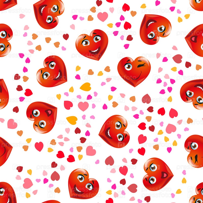 Бесшовный узор. Смешные милые лица персонажей красные сердца в День святого Валентина