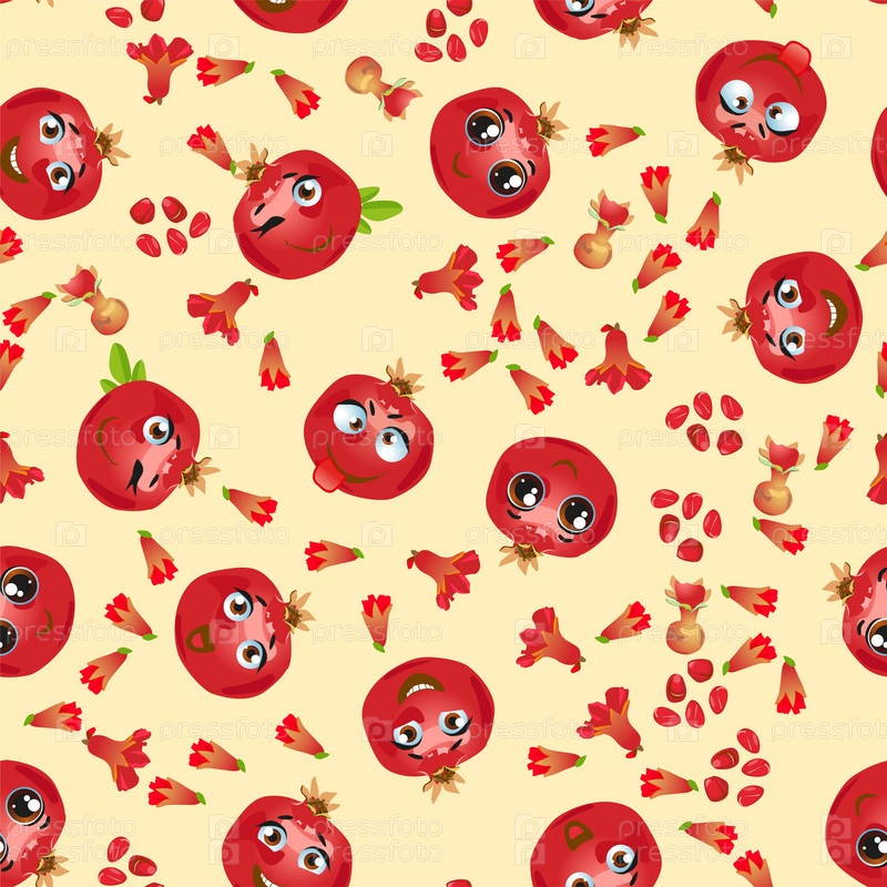Бесшовный узор из экзотических фруктов граната. Смешные милые лица персонажей