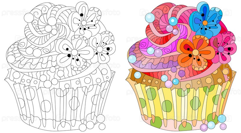 Векторный кусок пирога с абстрактными орнаментами. Ручная иллюстрация для футболки в стиле зентенгл, каракули. Набор цветов и контуров